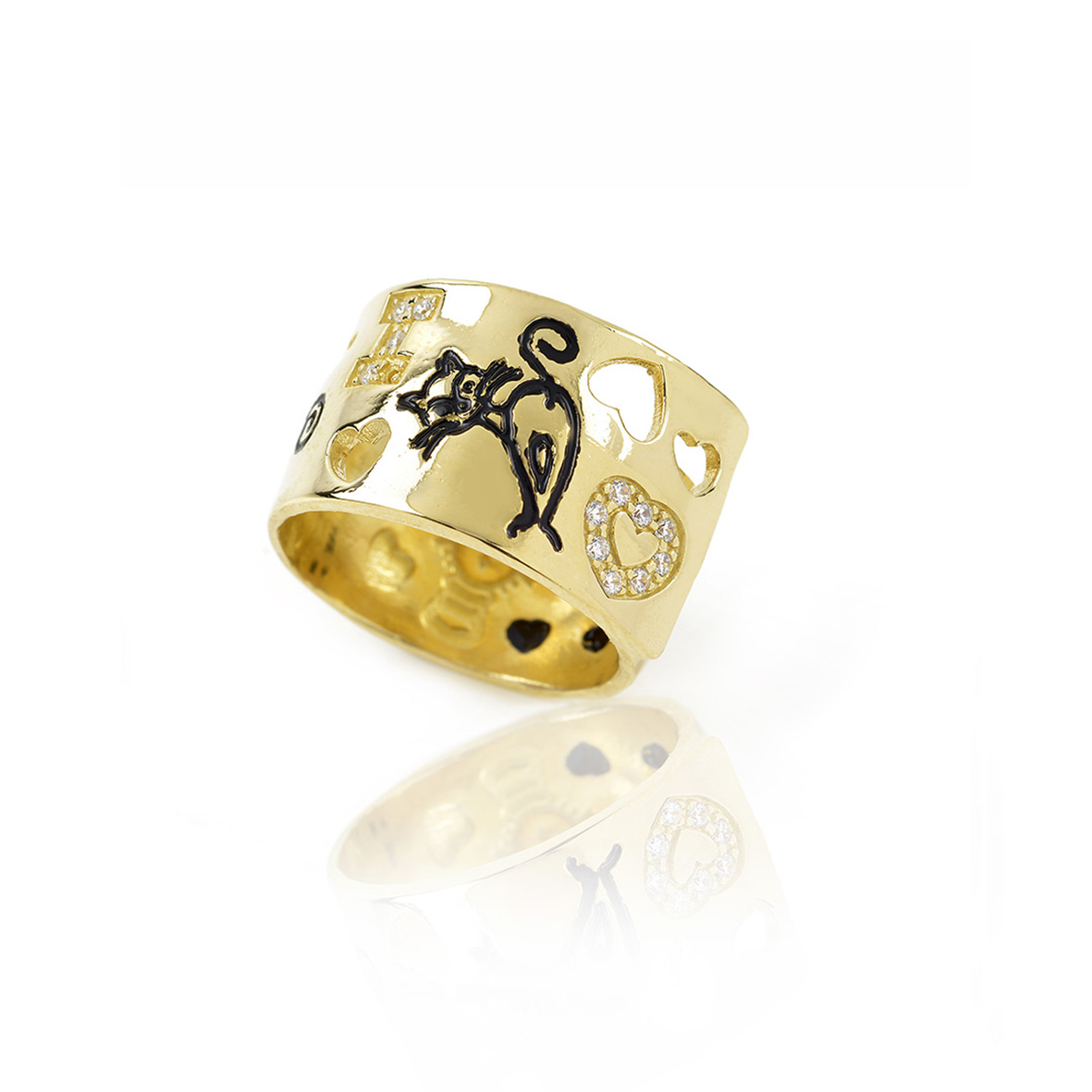 Anello in Argento 925 bagnato in Oro Giallo (18 Kt) con Cristalli Swarosky e smalto Nero