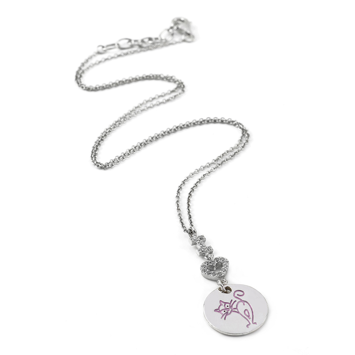 Collana La Gatta I LOVE CATS , Pendente rodiato con Cristalli Swarosky e smalto color Rosa Tiffany